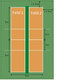 Das Spielfeld ist 9 m lang und 4 m breit (halbes Hallenfeld mit 1 m Sicherheitspuffer zum Nachbarfeld).